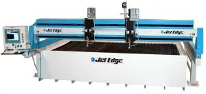 The Jet Edge large-format Mid Rail Gantry Waterjet System features a 21’X13’ work envelope with an exposed tank that easily accommodates overhead loading. It comes standard with one abrasivejet cutting head; a second cutting head can be added to increase productivity.