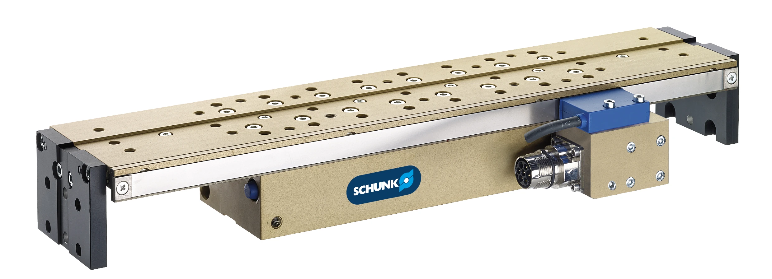 SCHUNK has combined a powerful linear motor drive with an ultra-smooth pre-loaded roller guide for its ELB linear axis and is designed for precise and dynamic strokes. The result is an extremely compact, rigid and dynamic module which is able to position high loads with excellent repeat accuracy of 0.01 mm. The maximum acceleration is 100 ms-2 and the maximum speed is 4 ms-1.