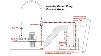 Cincinnati, Ohio – Removing coolant that naturally accumulates in a chip hopper enables longer production runs, eliminates messy cleanouts and reduces coolant costs. A new venturi pump kit from LNS makes the process of removing coolant from chip hoppers virtually effortless.