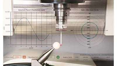 Parallelism of the axis of rotation and accuracy of its center are fundamental characteristics for the proper functioning of a machine tool with rotary axes. AxiCheck takes measurement to determine the reference values on a calibration sphere, mounted on the machine table to determine the machine’s operating health. Designed for use on 3- and 5-axis machines, AxiCheck is capable of monitoring and optimizing the performance of the rotating axes (5 Ax) while detecting any deterioration in the machine’s linear axes (3 Ax) in real time. It also features warning and alarm messages to alert the user if the measurement is out of tolerance.
