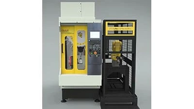 JobShop Cell PRO features an industrial grade, articulating Fanuc 6-axis robot in an aluminum enclosure which allows the RoboDrill to be placed on the left or right side, or in a twin cell with two machines. In the twin cell, two side-by-side RoboDrill machines with a Fanuc robot entering from the side of each machine gives operators full, open access to the front of the RoboDrills for tool changes, off-sets, and maintenance. Removable panels on the common enclosure allow for several different infeed and outfeed options including conveyors, drawers, lazy susan style pallet systems, as well as interfaces for vibratory and other bulk feeding solutions.