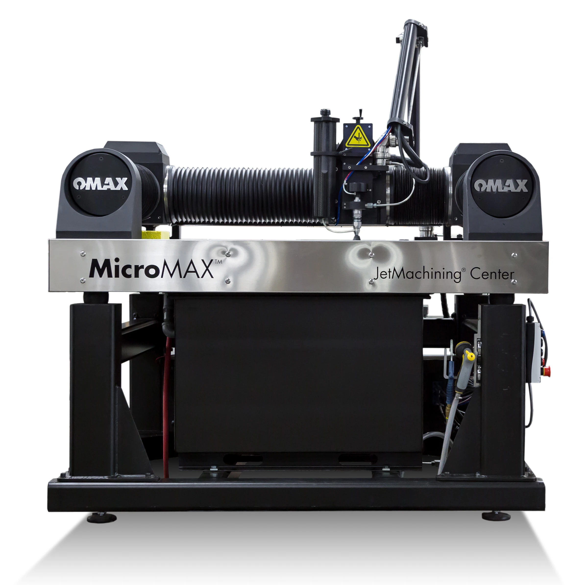 The MicroMAX comes equipped with a high precision 7/15 Mini MAXJET5i nozzle that features a 0.007” orifice and 0.015” mixing tube combination for quickly and accurately cutting delicate, complex patterns. Because it forms a jet stream carrying an extremely fine abrasive, the nozzle can produce a kerf as small as 0.015”. The machine also has advanced pressure controls for piercing delicate materials.