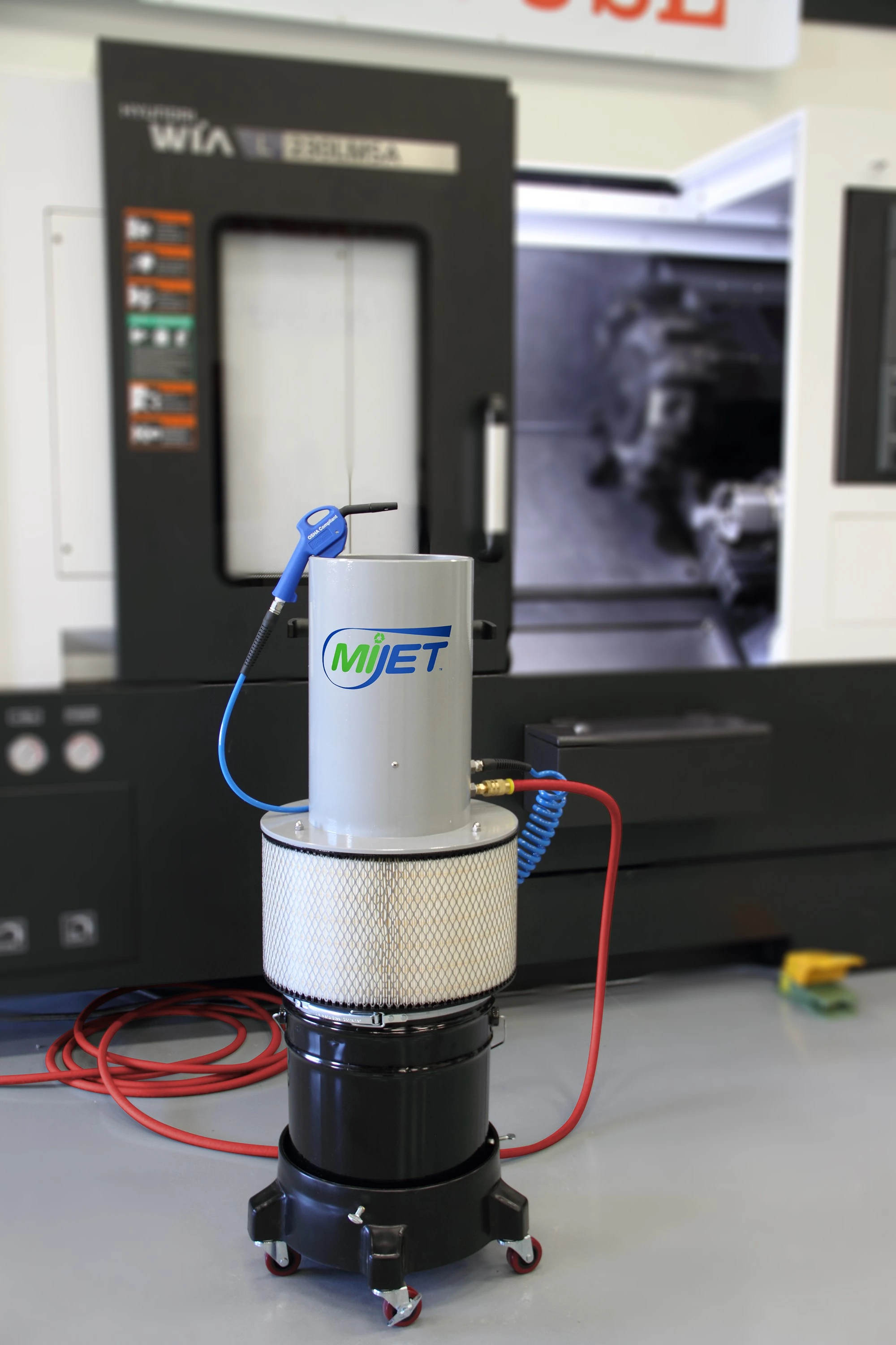 MiJET utilizes an existing shop air line and is easy to incorporate into a work cell since no electricity is required. Portable, with a small footprint, the unit can easily be installed next to each CNC machine while still making valuable shop floor space available for other operations.