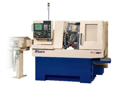 The compact BX-26S (87 x 52) also offers revolving tool (8 tools max at 4,000 RPM max), L-spindle brake, cut-off confirmation (by spindle torque), parts catcher & parts conveyor, high pressure coolant (160 psi), right spindle inner coolant and all axis rapid traverse (944 IPM) and an optional hinge type chip conveyor (right side discharge). Miyano is known worldwide as a leader in precision machine technology. Their U.S. facility houses over 50,000 stock parts, making it the backbone of Miyanos superior service department. Miyano provides complete technical support and service.