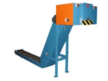 The MunchMan hinged steel belt conveyor is designed to handle the heavy chip loads with large stringy chips and balls of chips generated in milling and turning applications where high work piece stock removal rates exist. The MunchMan employs a unique stacked conveyor arrangement at the lower curve and through the incline and chip discharge of the system.  A traditional horizontal hinged belt load section transitions to the incline when a second hinged steel belt conveyor mounted above the primary conveyor is running the belt in the same direction as the primary belt. Both belts are designed with carrying cleats. As the chips and stringy balls of chips go through the transition at the lower curve, the chips and chip balls are literally sucked in and pinched between the two moving belts through the incline and discharge area.  Chips are effectively compressed and trapped until they are forced off the discharge end of the conveyor. The MunchMan can be designed to fit into most of today’s CNC lathes and machining centers, and has little or no effect on the space required vs. traditional single belt chip conveyors.