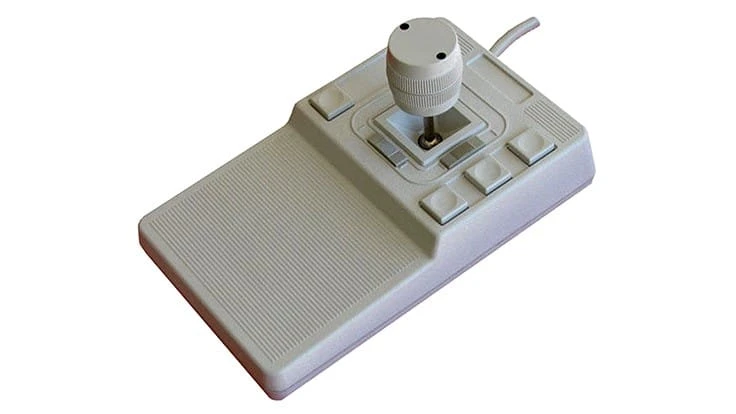 The two slide switches engage/disengage the joystick for shipping. For stability, the footprint of these joysticks is 4.76 inches wide by 7.80 inches long. The Joysticks have a 5.5 feet long cord, and the standard connector is a 25-pin-DB-25, male connector.