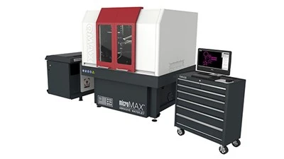 The MicroMAX has a small footprint and a steel, epoxy-coated enclosure with sliding doors for quiet, clean machining. A mobile work station with easy-to-use controller software provides the operator with convenient set-up and monitoring capability.