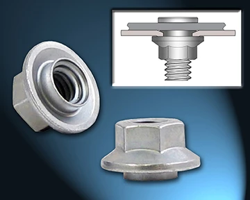 PEM Type SFN one-piece flanged steel hex nuts install easily in steel, stainless steel, or aluminum sheets of any hardness and as thin as 1mm. Upon installation, the nut becomes permanently captive and will spin freely in the sheet to accommodate mating hardware for final component attachment.