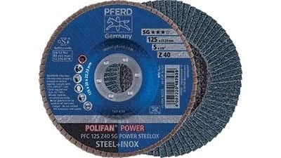 This high-performance, Zirconia alumina Z abrasive handles demanding grinding work, delivering optimum stock removal on high-powered angle grinders even at higher contact pressures. The POLIFAN Z SG POWER STEELOX flap discs are specified for use on steel and stainless steel (INOX).