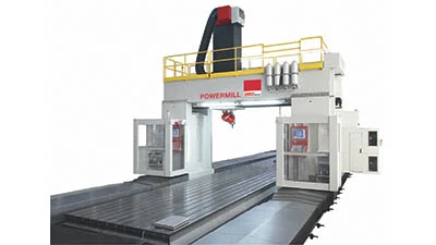 Novi, Michigan – The large Powermill machining center from Mecof, part of EMCO Group, provides users precision, high dynamics, operational flexibility, and cost-effectiveness in a massive travelling gantry 5-axis milling center. Powermill with its moving bridge structure, permits loading of large, heavy workpieces on the stationary work table from overhead or from either end of the machine for handling aerospace components. Simple overall design makes possible easy positioning, set up, and clamping of huge workpieces of practically unlimited weight.