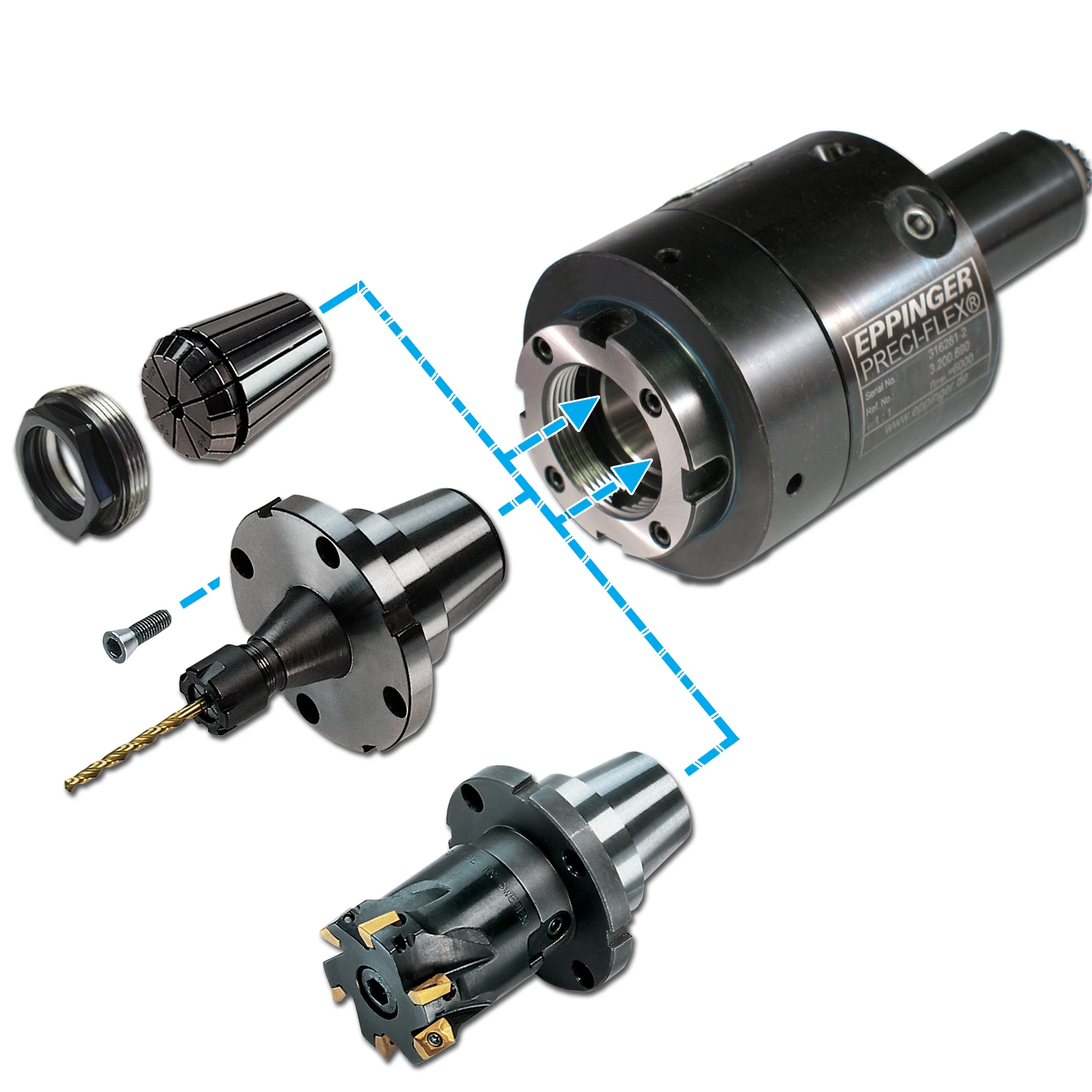 The PRECI-FLEX conical and flat-face planar interface duplicates the taper of the standard ER collet, enabling ER collets, albeit at lesser repeatability, to be used along with PRECI-FLEX adapters to mount collets, endmill holders, expanding collet chucks and shrink fit tooling on a single base holder. Operated at the front face of the turret, the connector provides two tons of clamping force, and its compact design maximizes torque transmission and rigidity, increasing accuracy and productivity.