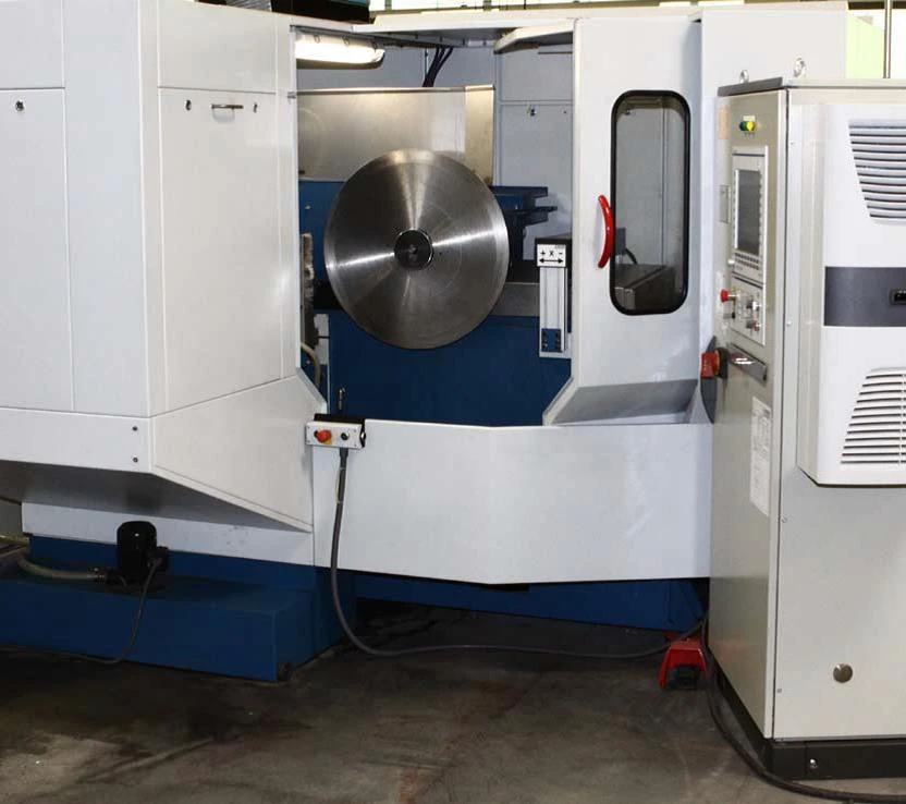 CNC-grinding machine with three or four axes for grinding of blades and bevels on circular knives by employing a cup wheel for high chipping; programmable angle adjustment for following processing