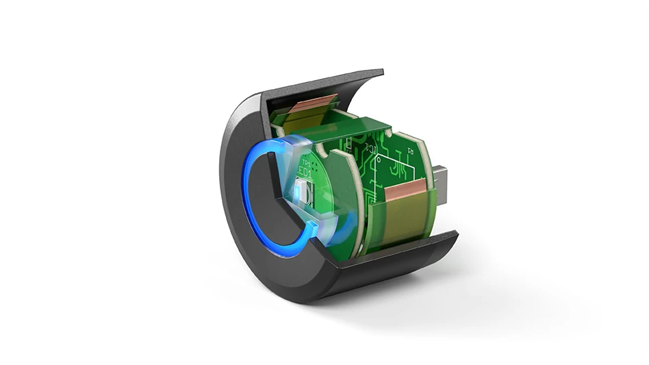 The advantages of such a rotary encoder are obvious. The concept is absolutely tight. As the bulge for the sensor rotary encoder is directly cast into the front panel of the end device, the surface remains completely closed. It can be ideally integrated into acrylic glass or plastic surfaces. Without any movable parts, wear by friction or contamination is excluded. Thus, the whole system is extremely resilient to ambient conditions and easy to install.
