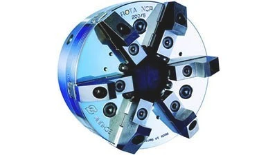 The NCR also can be outfitted with optional centrifugal force compensation and has provisions for coolant and air media pass-through. As standard features, the NCR includes optimized internal greasing system, hardened chuck body, and hardened and ground internals. The NCR is available in diameters of 165mm, 200mm, 250mm, 315mm, 400mm, 500mm, 630mm, 800mm, 1,000mm, and 1,200mm with serrated or metric tongue and groove base jaw interfaces.