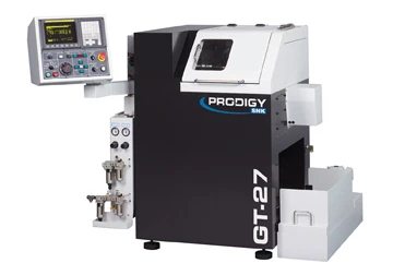 The SNK Prodigy GT-27 gang tool lathe features C-Axis spindle as standard, a polymer base and precision components for fast and accurate small parts turning. The Prodigy GT-27 lathe uses three axes of motion that can be commanded in absolute or incremental modes. The Prodigy C-Axis spindle allows for indexing and positioning as well as more advanced functions including interpolation and polar coordinate milling. Compared to traditional cast-iron or Meehanite casting, a polymer composite base provides significant vibration reduction and improved surface finish, while extending tool life by up to 40%. Furthermore, the polymer is resistant to oxidants and thermal distortion. The Prodigy GT-27, with its polymer base, weighs in at 3420 lbs. This heavyweight construction provides unmatched rigidity and superior accuracy. Precision and versatility is achieved through the incorporation of non-heat generating collet closers, the absence of a turret and full C-Axis indexing positioning. The Prodigy GT-27 can index in .01 degree increments. As a result, live tooling can be used for side drilling and milling operations, performing both simple and complex operations easily. The nature of the design of the gang tool lathe, where the absence of a turret eliminates tool changes, lends itself to increased cycle times, as well as precision. The Prodigy GT-27 spindle speeds reach up to 6,000 rpm. SNK Prodigy GT-27 GE Fanuc Controller contributes to ease of operation, as well as faster and more responsive performance (with the inclusion of brushless digital servo drives). The Prodigy GT-27 is ideal for both first and secondary machining operations in a variety of applications, including medical, automotive, commercial, ceramics and fasteners. The Prodigy GT-27 can also perform rigid tapping with ease. Maximum production bar work is up to 1 1/16 inch diameter. SNK Prodigy has combined the best of both American and Japanese engineering and manufacturing to produce the new Prodigy GT-27 Single Spindle Gang Tool Lathe. The result is an American-made small part gang tool lathe that delivers optimum accuracy and cycle times. SNK, a world-leading manufacturer of bridge type machining centers and multi-axis profilers, is proud to announce their new line of polymer based small accurate machine tools under the new Prodigy brand. Prodigy local service and support is provided through SNK extensive full service dealer network. The expertise of SNK dealer network allows for customization with live tools, bar feeders, loaders/unloaders, options and applications support. For more information, visit www.snkamerica.com, or contact SNK America, Inc., 1800 Howard Street, Elk Grove Village, IL 60007, Phone: (866) 379-6068, Fax: (860) 379-6095, E-mail: prodigy@snkamerica.com.