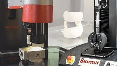 The Starrett AVR300 CNC vision system is for repetitive measurements with high accuracy, providing automatic comparison to CAD files. The compact bench top system offers 12" x 8" x 8" travel, Z-axis measuring, and MetLogix M3 software for video edge detection. The AVR300 systems are available with 6:5:1 (optional 12:1) zoom optics or a quick-change bayonet lens mount that accepts a choice of six interchangeable telecentric lenses for micron-level resolution and optical distortion down to 0.001% for accurate field-of-view (FOV) measurements.