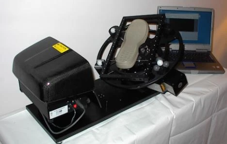 The system features a rotating SLP-2000 laser probe with a line length of 200 mm and a fixture mounted to a precision rotary stage that holds the shoe sole or other type of part. The SLP-2000 laser beam is swept from left to right over the part. Then the part is repositioned by the rotary stage and another scan pass is taken.