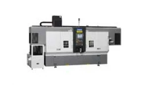 Twin spindles, a gantry robot and slant bed are among the features of the TNW-3500R. A live tool turret performs secondary operations; live tool motor power is 3/5 hp. For built-in automation, the TNW3500R features a FUJI gantry loader with a 22 lb. capacity and dual 10 tool turrets.