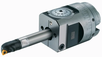 From a machining diameter of 1.3 in., the precision boring heads are fitted with an automatic imbalance compensation feature, making them self-balancing. A mechanism inside the tool is coupled with the insert holder adjustment. When the indexable insert holder is adjusted, a compensating weight is constantly displaced to allow an even distribution of weight ratio at all times. If the machining diameter is higher than 2.76-in., the ScrewFit thread is replaced by a NCT connection. The largest precision boring heads, which have a diameter range of 3.54-in. to 6.02-in., are made of aluminum to reduce the rotating mass.