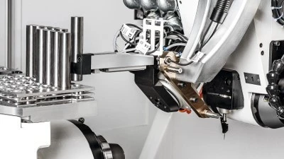 In addition to its low-vibration gray cast iron frame and gantry-type construction, the Helitronic Raptor is designed to accommodate a range of options, including top loaders with up to 500-tool capacities integrated in the working area. Other options include glass scales, A-axis torque drive, a grinding wheel measuring probe, and a manual support steady rest.