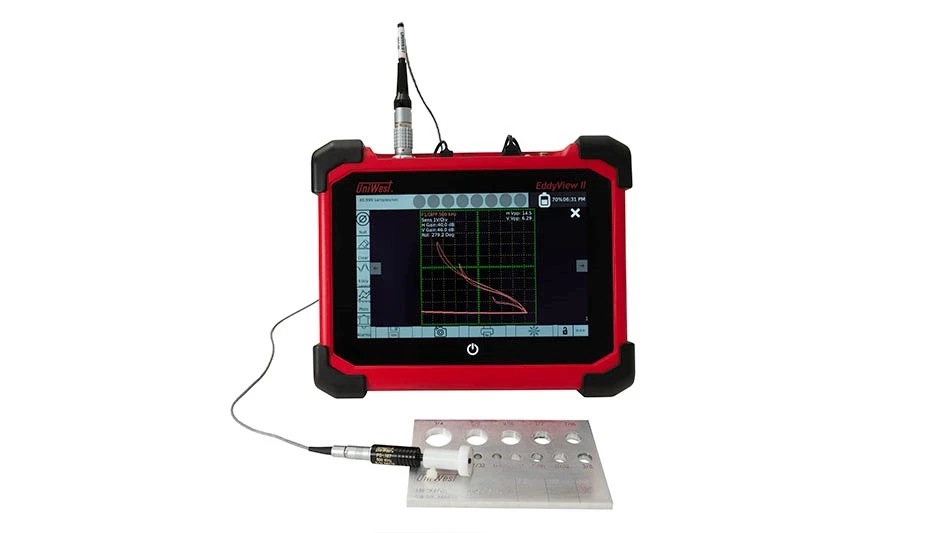 UniWest’s EddyView II portable eddy current flaw detector features a large 8-inch touch screen display with gesture adjustments for key parameters such as gain and rotation, ability to drive conventional probes or array probes, an independent channel that monitors probe to part coupling (liftoff), and UniWest’s industry-leading signal performance with extremely low signal-to-noise.