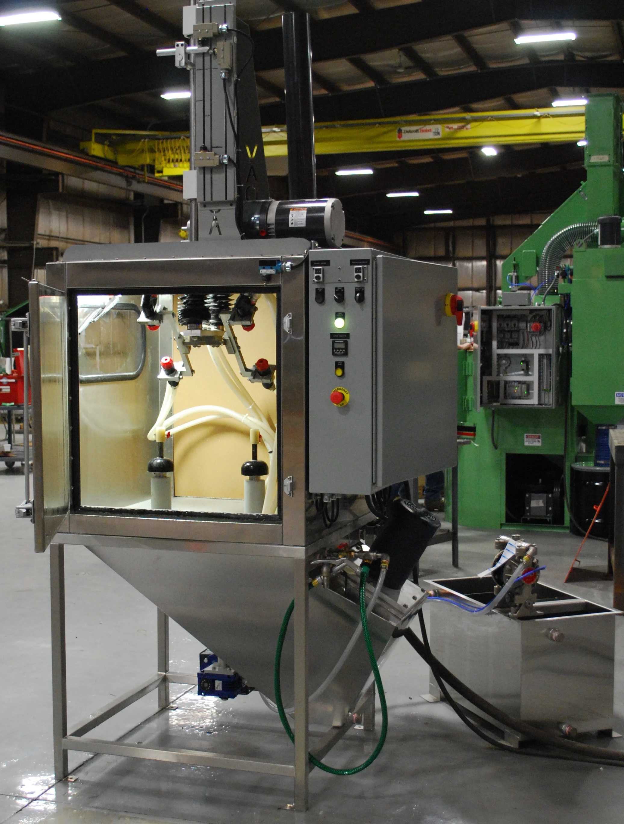 Guyson Corporation has introduced a compact industrial slurry blasting machine with two rotary spindles and programmable motion of the wet-blast guns for blast cleaning and surface preparation in the work cell.