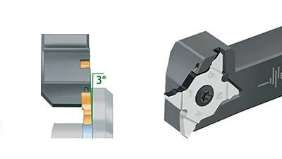 Standard large contact surfaces and the patented dowel pin location in MX indexable inserts lead to a high degree of stability, precision, and indexing accuracy. The tangential arrangement of the grooving inserts improves flatness and surface quality.