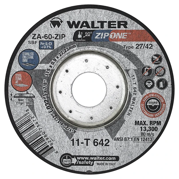 Manufactured with an iron-free mix, ZIP ONE TYPE 27 cuts cooler and faster and is guaranteed not to contaminate stainless steel. It avoids discoloration of the work piece and cuts burr-free, reducing post-cut finishing. Formulated for high performance, the ZIP ONE TYPE 27 wheel has a significantly longer life compared to other ultra-thin wheels, offering more cuts per wheel and the lowest price per cut.